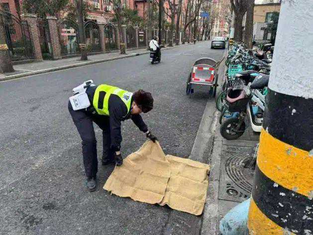 在对结冰路面进行排摸的过程中,静安交警发现光复路普济路桥、大统路地道等多个路段的结冰路面,容易出现安全隐患,随即进行及时处置,通过撒融雪盐、铺设草包等防滑措施,保障道路通行安全。
