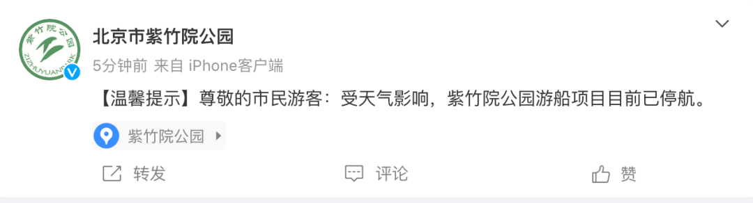 据@北京市紫竹院公园消息,受天气影响,紫竹院公园游船项目目前已停航。
