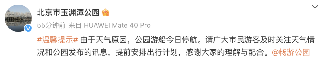 据@北京市玉渊潭公园消息,由于天气原因,公园游船今日停航。