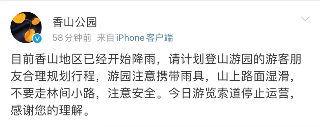 据@香山公园消息,今日游览索道停止运营。