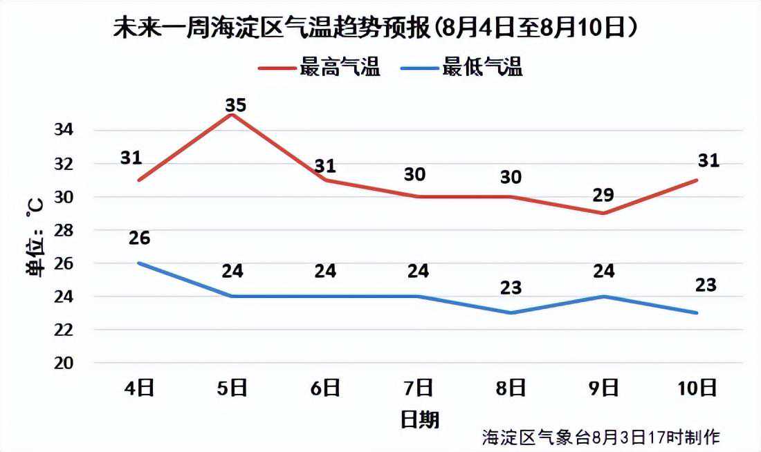 海淀区气象台2023年08月03日19时30分发布暴雨黄色预警信号:预计8月4日04时至18时,海淀区有小时雨强超过50毫米的短时强降雨。山区及浅山区出现强降水诱发的中小河流洪水、山洪、地质灾害等次生灾害风险较大,城市低洼地区容易出现积水,请注意防范。