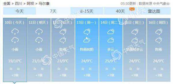中央气象台预计,今起三天,马尔康市多降雨,其中今明天有小雨,后天有阵雨。早晚气温较低,最低气温在10℃左右,最高气温19~23℃。