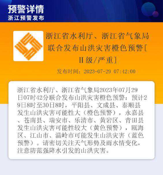 浙江省水利厅、浙江省气象局联合发布山洪灾害橙色预警[Ⅱ级/严重]