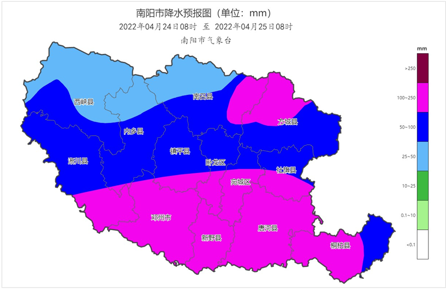 南阳市气象台2022年4月24日11时00分发布暴雨蓝色预警信号:预计4月24日17时至25日05时,南阳市区及所辖乡镇和街道降水量将达50~100毫米,局地可能达到150毫米以上,并伴有短时强降水、8~10级雷暴大风和局地冰雹等强对流天气,最大小时雨量40~70毫米。请注意防范强降水引发的山洪、泥石流和城市内涝等次生灾害。