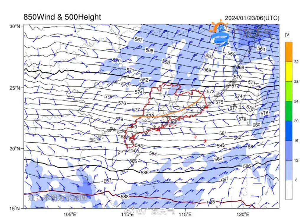 23日冷高压携850hpa切变影响广东大部,北风加小雨/雪,体感非常寒冷。