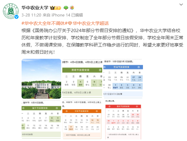 早在3月28日,华中农业大学发布公告称,结合校历和年度教学计划安排,学校制定了全年部分节假日放假安排,学校全年周末正常休假,不做调课安排。