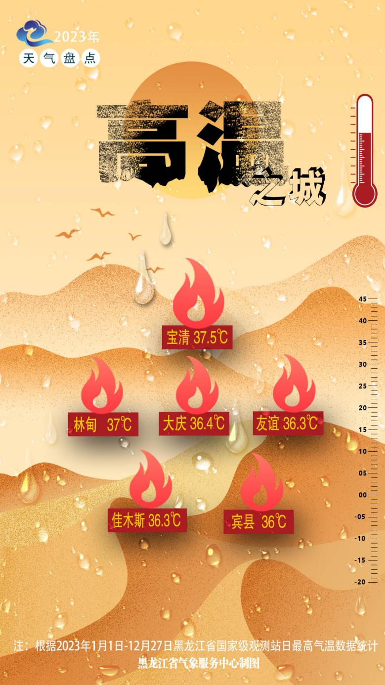 2023年度黑龙江省日最高气温极值排名前六的地区分别为:宝清、林甸、大庆、友谊、佳木斯、宾县。此次入选榜单地区的最高气温极值都没有超过38℃,可见黑龙江省的夏天火热程度非常有限,仍以清凉舒适为主旋律,适宜避暑消夏。