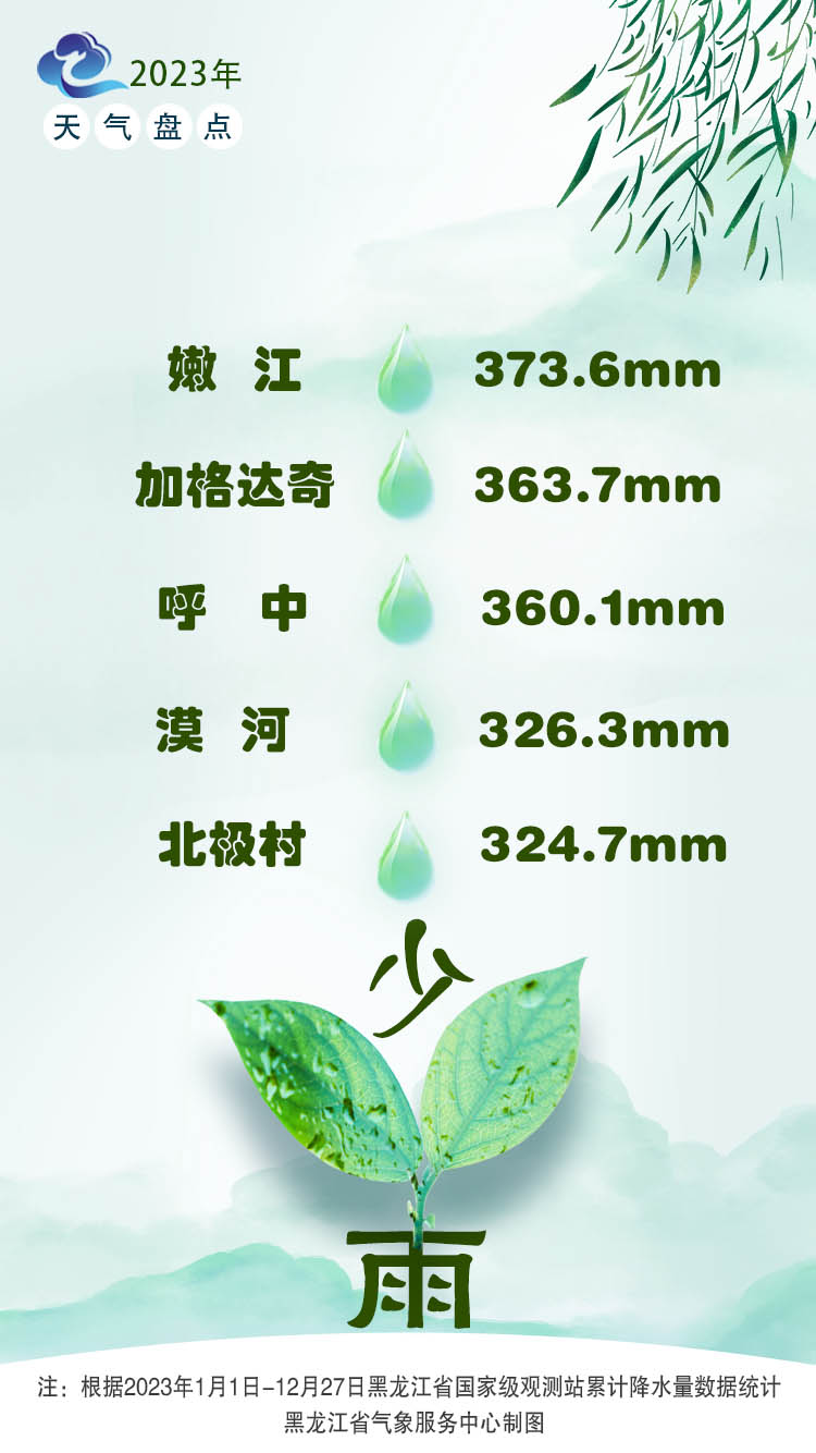 2023年度黑龙江省年降雨量最小值排名前五的地区分别为:北极村、漠河、呼中、加格达奇、嫩江,均位于黑龙江省西北部,其中北极村年降雨量仅为324.7毫米,成为年度降雨最少之城。