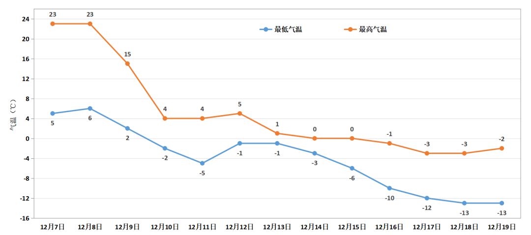 受冷空气和雨雪的共同影响,9日起气温急剧下降,中旬气温持续较低,16日至19日,全市最高气温零下3℃~零下1℃,最低气温零下13℃~零下10℃。