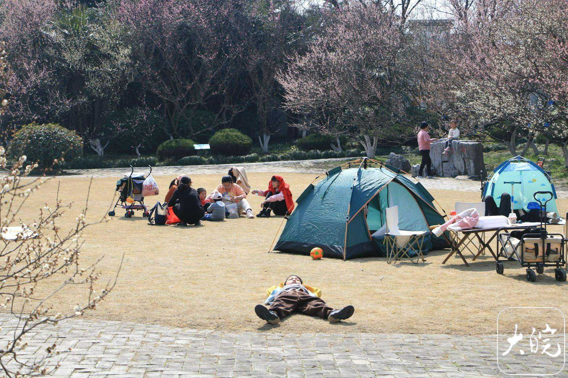 游客在草坪上赏花、野营。