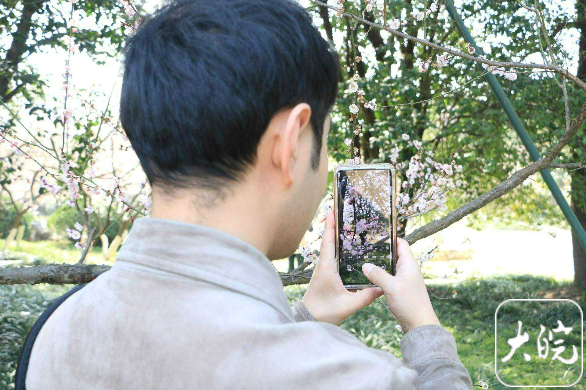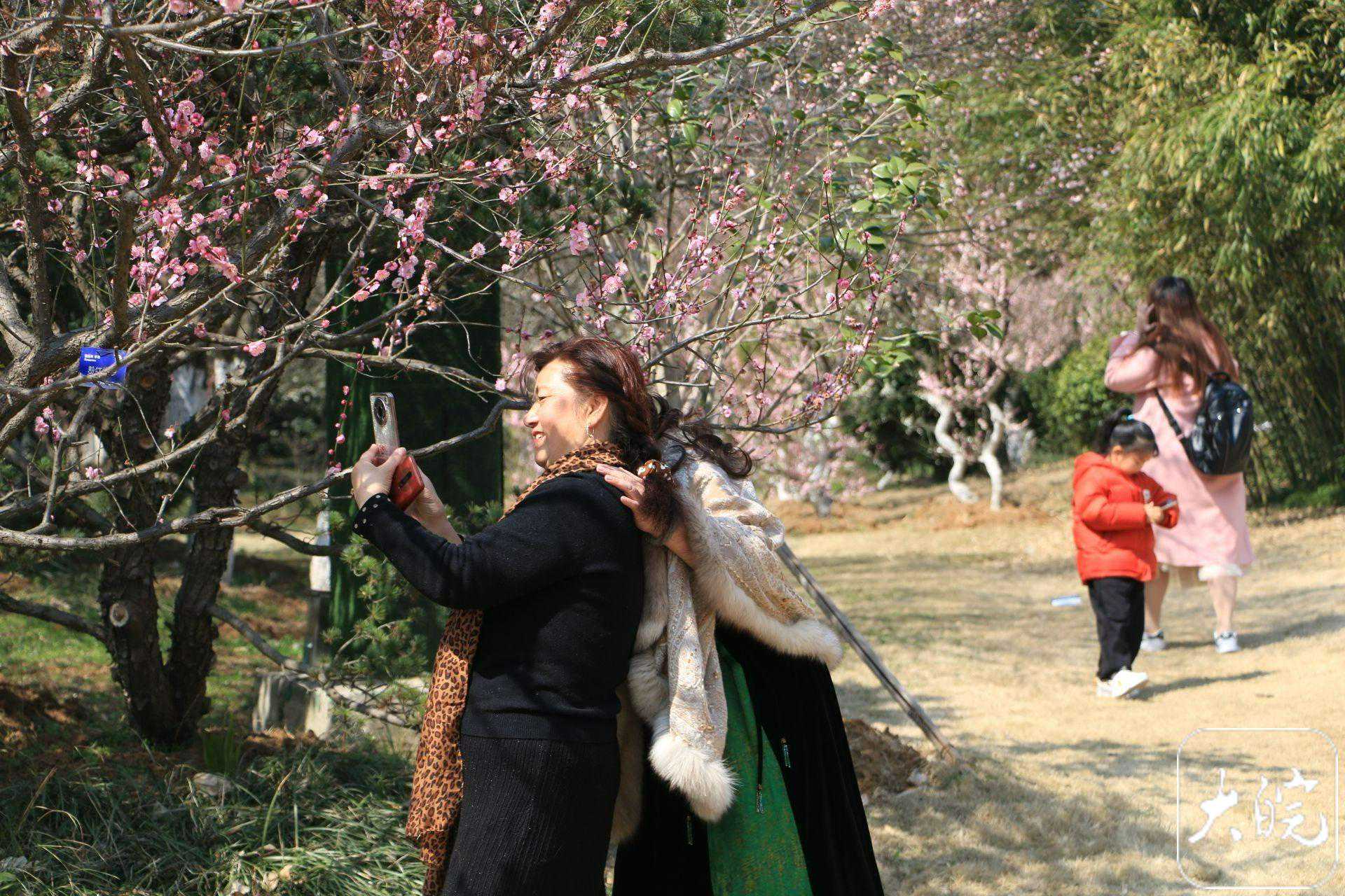 盛开的梅花吸引游客拍照留念。