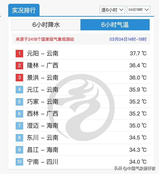 但也在3月4日这天,我国南方的西南、华南多地的天气明显的开始变得不一样,像是华南沿海的海南岛,今天白天烈日当空,强盛的南风吹袭而来,澄迈达到35度高温,海口高达33.8度。中央气象台的排行榜上可见,除了海南,云南广西多地气温也达到了35度以上。