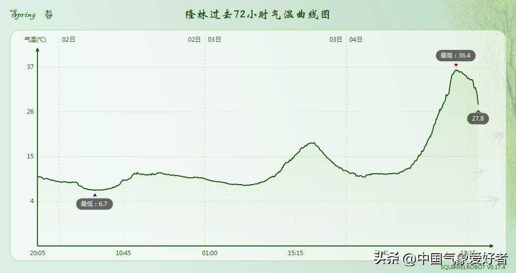 而在广西,一些出现高温的城市其实也有类似的升温变化——例如今天出现了35度以上高温天气的广西隆林,3月2日最低气温一度只有5度出头,3月2日全天气温不超过15度,但就在强盛南风的攻势下,隆林气温大幅上升,直接从寒凉的体感跃升到35度以上的盛夏体感。