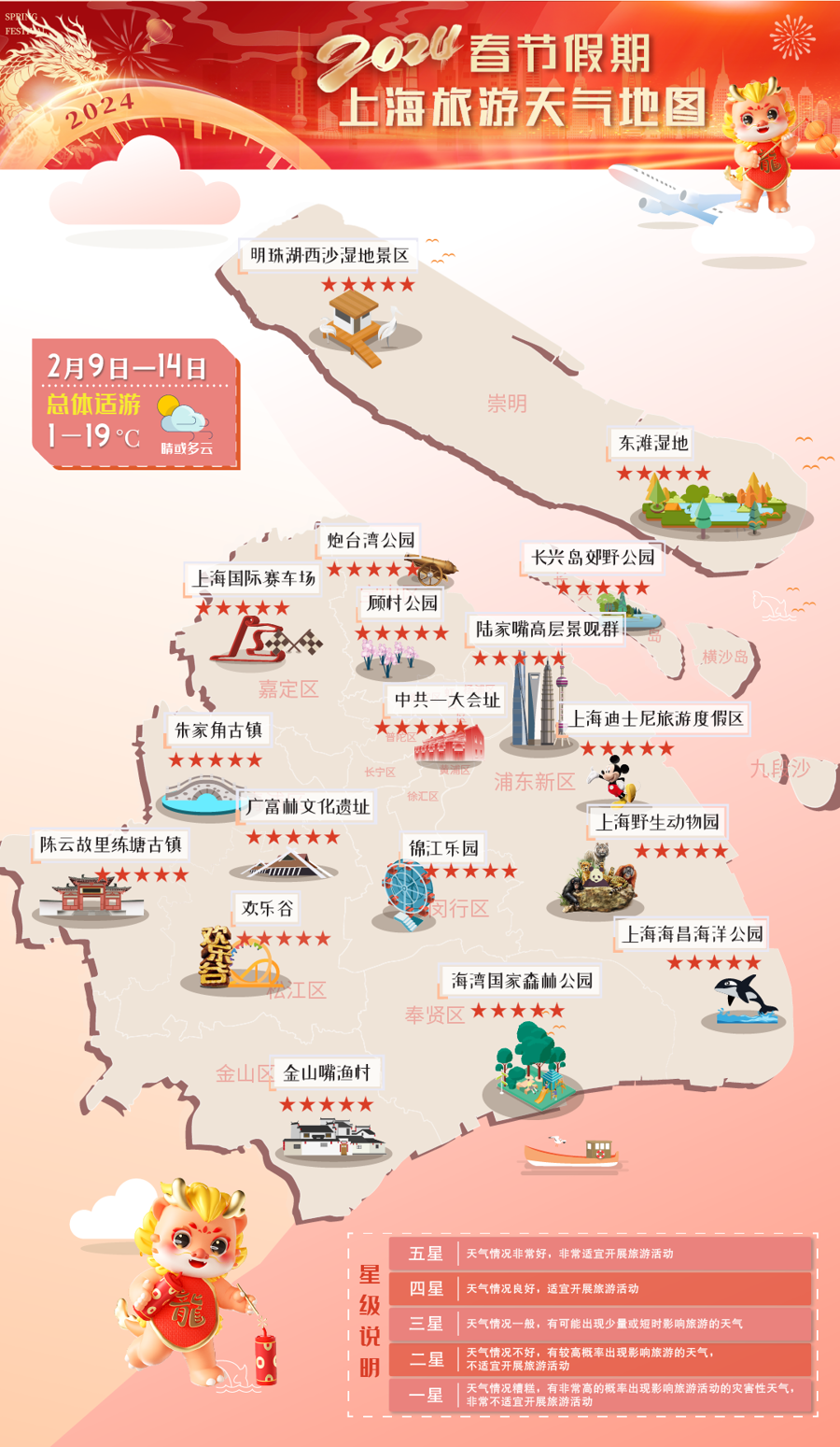 今天(2月7日),上海市气象局公布春节天气预报,春节假日前期,申城以晴或多云天气为主,气象条件总体适宜旅游。假日后期有一次降水过程。气温方面,先升后降,总体偏高。空气质量以良为主。