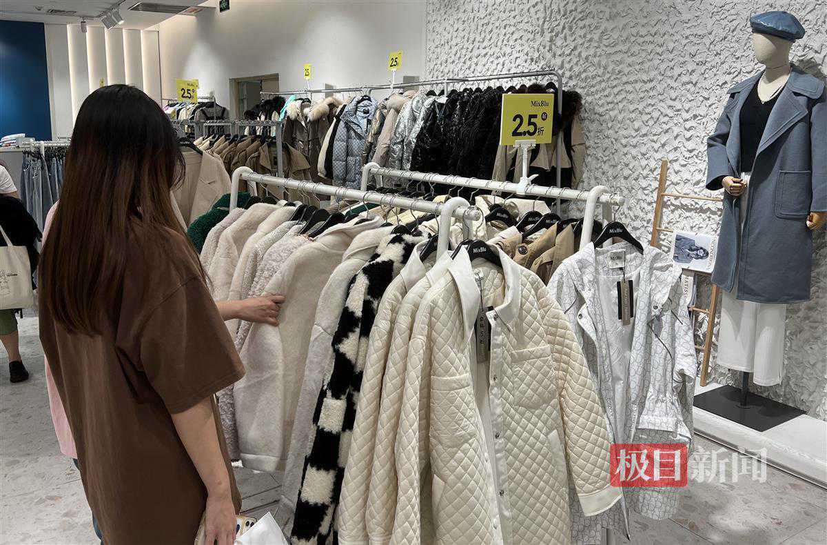 多家服装店内,反季的冬装毛呢外套、羽绒服、棉服在售,低至2折,吸引了不少顾客选购。