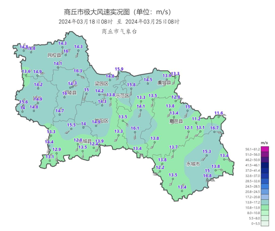 上周23日至24日出现降水天气,23日我市中雨,部分地区大雨,24日小到中雨,部分地区伴有雷电等对流天气,总降水量21.4mm(夏邑)~39.0mm(永城);其他时段以晴或多云天气为主。3月21日、23日和24日,我市出现大风天气,极大风速出现在永城芒山站15.3m/s(7级)。上周最低温度1.1℃(睢县)~3.7℃(柘城),最高温度22.5℃(商丘)~23.9℃(永城)。