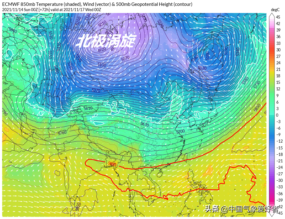 很显然,11月13日台湾下雪只是一小波冷空气所为,其实算是上一股寒潮的残部,但实际上,完全算不上一次真正的寒潮。不过,高纬度冷源确实已经蠢蠢欲动——超级计算机的预测认为,高纬度环流形势正酝酿剧烈振荡,这种变化的一个结果是,北极涡旋将再次偏向亚洲,在11月17日前后来到西伯利亚上空,堆积起大量的严寒气团。