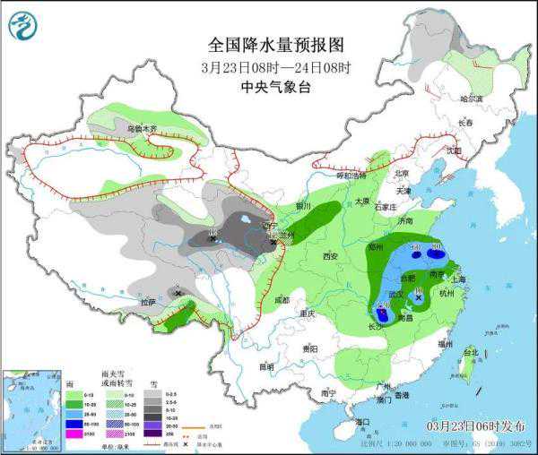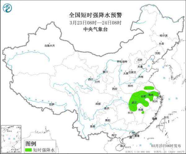 3月23日8时至24日8时,安徽西南部、湖北东部和南部、湖南西部和东北部、江西中北部等地的部分地区将有8至10级雷暴大风或冰雹天气;河南南部、安徽中南部、江苏中南部、上海西部、湖北中东部、湖南东北部、江西中北部、浙江北部等地的部分地区将有短时强降水天气,最大小时雨量20至40毫米,局地可达50毫米以上。