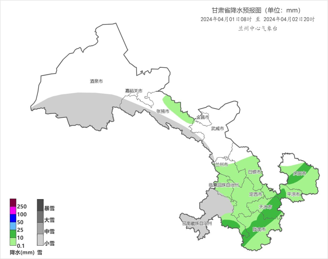 今天夜间到明天白天(04月01日20时-04月02日20时),甘南、陇南、天水、平凉、庆阳等州市阴有小雨(雪)或雨夹雪,局部地方有中雨;省内其余地方多云间阴,局部地方有小雨或雨夹雪。河西五市及白银、庆阳两市有4-5级西北风。