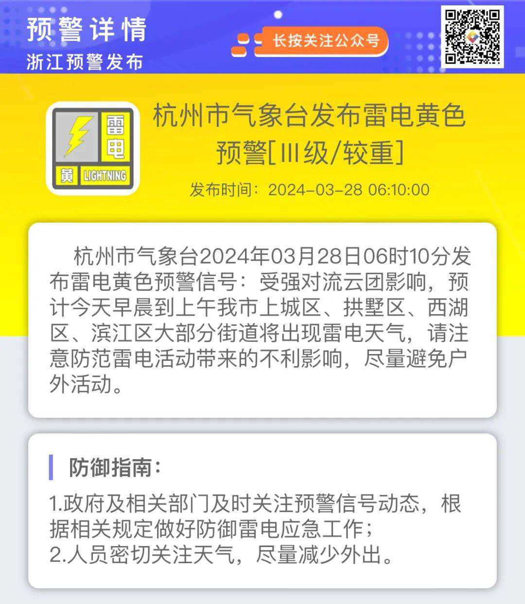 杭州市气象台2024年03月28日06时10分发布雷电黄色预警信号: