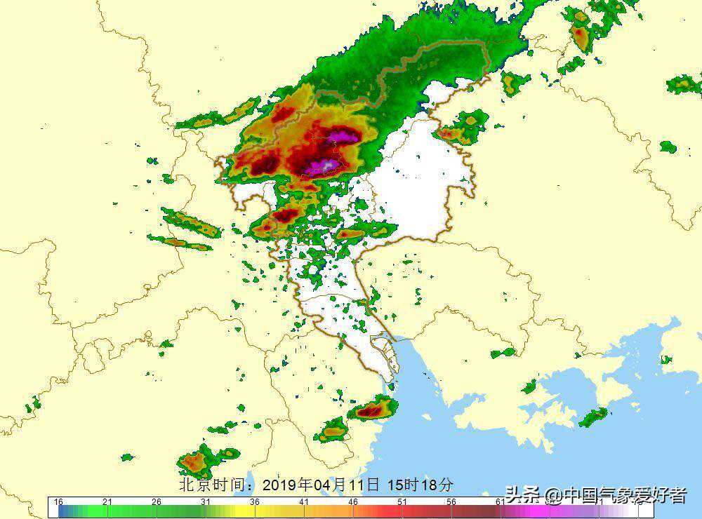 4月11日15时左右,这堆强对流云图中有一个强对流云团闯入珠三角地区,从雷达回波上看,广州西北部局地雷达回波红中泛紫紫中透白,表示雷达回波极为强盛,意味着极为凶猛的局地强对流天气。为此,广州多个区已经发布了强对流天气预警,部分区发布了雷电、大风和冰雹预警。事实上,除了广州要注意外,随着冷空气的继续推进,广东中南部的不少地方也得注意防范强对流天气,注意安全。