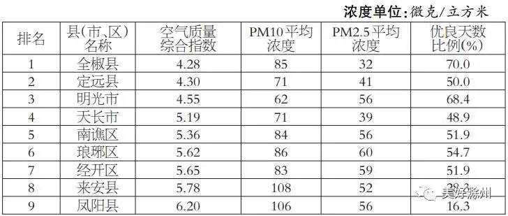 注:(1)空气质量排名采用空气质量综合指数大小来确定,指数越小表明空气质量越好。(2)空气质量综合指数是指评价时段内,参与评价的各项污染物的单项质量指数之和(单项指标评价时段内平均浓度与该指标二级标准限值的比值,SO2、NO2、PM10及采用年均浓度二级标准限值、O3和CO采用日均浓度二级标准限值),指数越大表明城市空气污染程度越重。(3)琅琊、南谯、经开区采用1-7月份数据;6个县(市)采用省控监测站点上收后数据,其中全椒县空气站点因未按时完成上收采用6-7月份数据,其他5个县(市)均采用5-7月份数据。