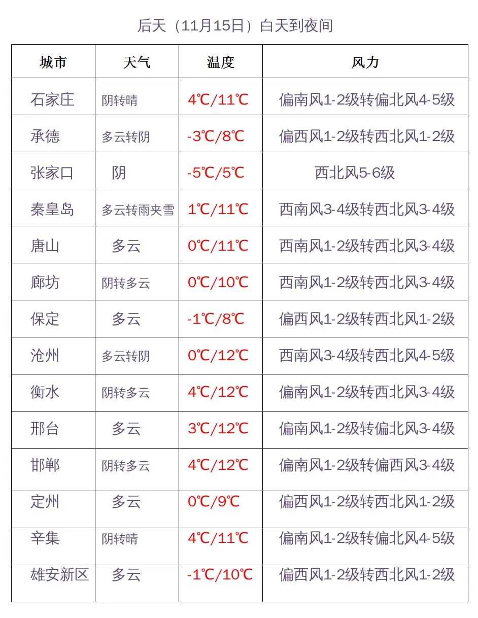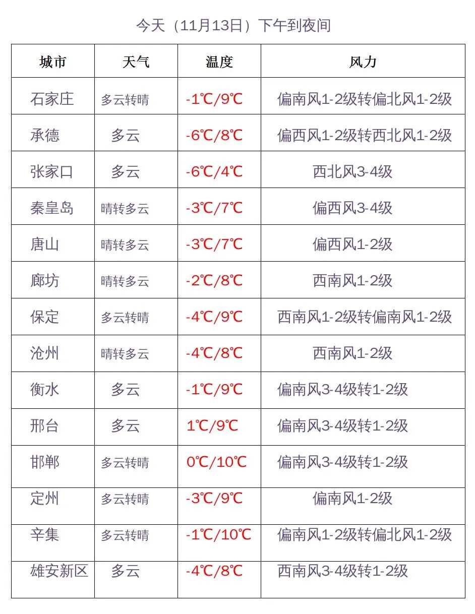 河北省气象台2023年11月13日11时发布天气预报: