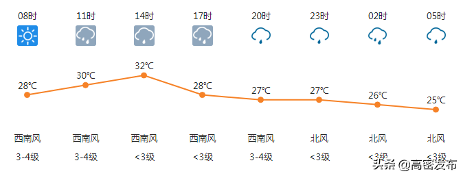 今天,多云转阴有小到中雨,并伴有雷电,南风短时北风3~4级,最低气温25℃,最高气温33℃。