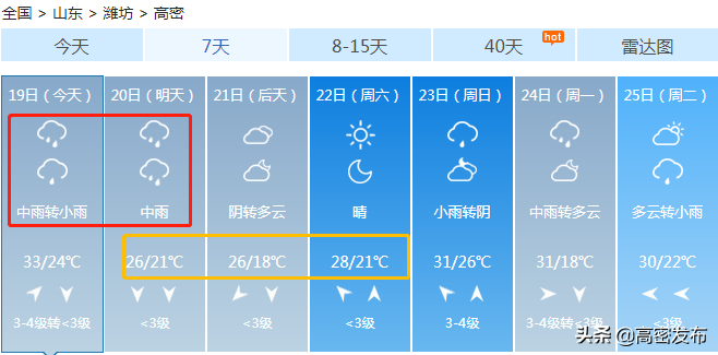 20日,阴有中雨,局部大雨,南风转北风2~3级,最低气温24℃,最高气温28℃。