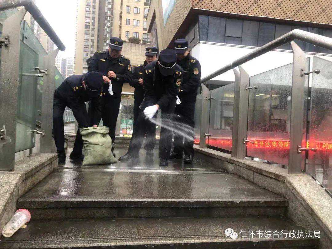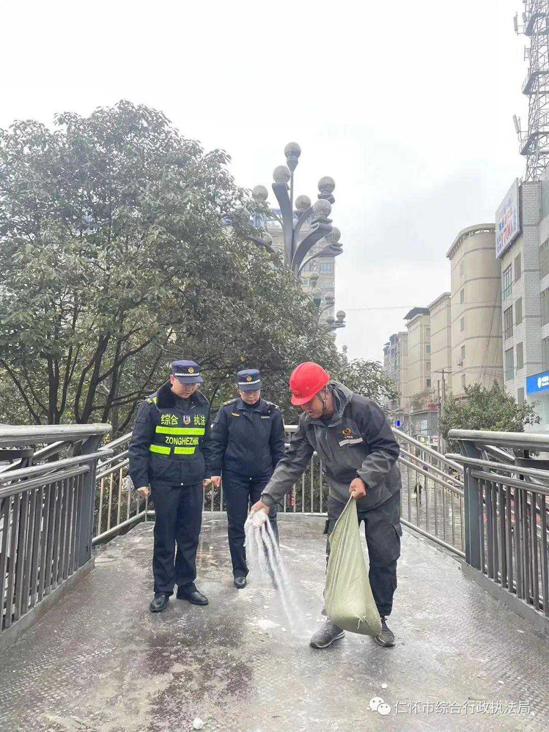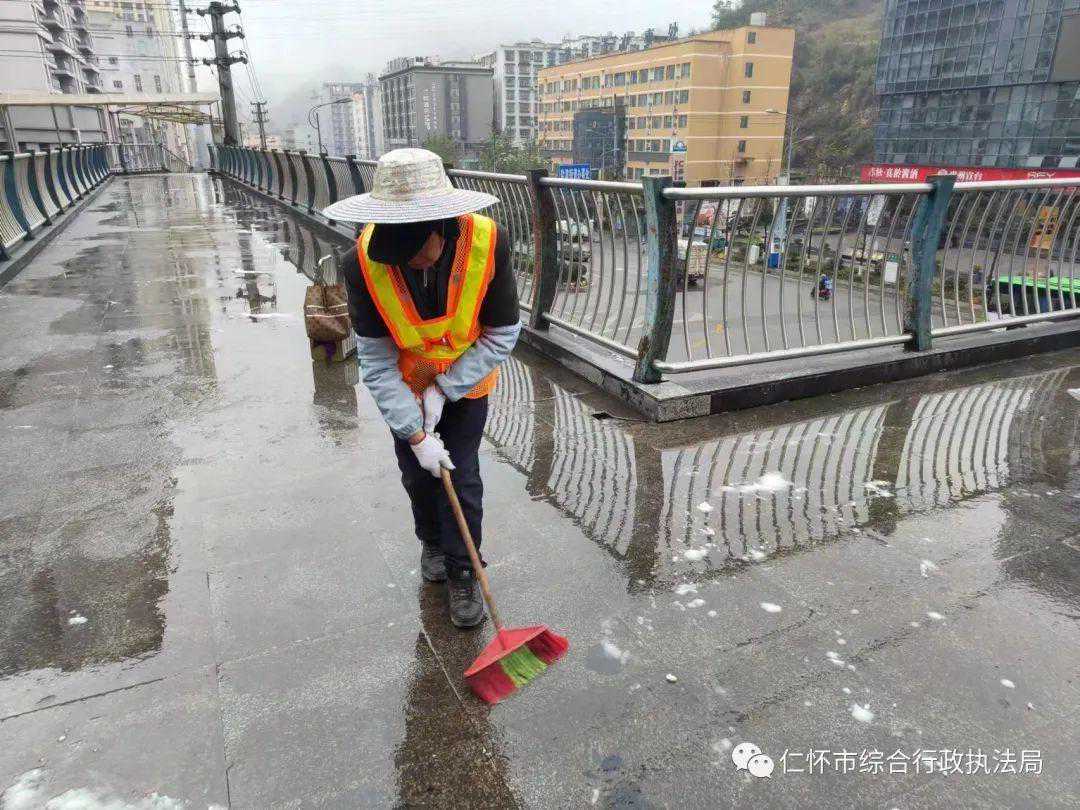 因城区人行天桥大多建在学校周边,为保障广大师生及群众出行安全,仁怀市综合行政执法局开启“硬核”除冰模式,通过划片区、定路段、分责任,对人员定岗定位执行除冰任务。