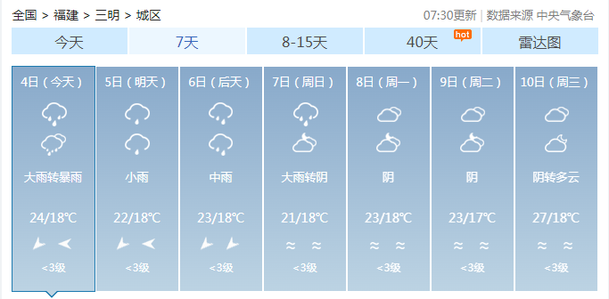 三明启动防暴雨IV级应急响应!三明市气象局4月4日7时30分发布“暴雨预警Ⅲ级”和“强对流预警Ⅲ级”。
