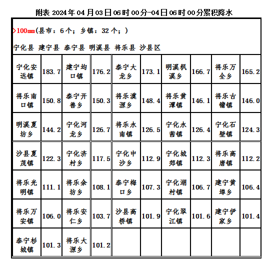 统计03日06时~04日06时,6个县(区)的32个乡镇降水超过100毫米,其中最大宁化安远镇183.7毫米,其次建宁均口镇176.2毫米,第三泰宁大龙乡173.1毫米(详见附表)。共有4个乡镇出现8级以上阵风。