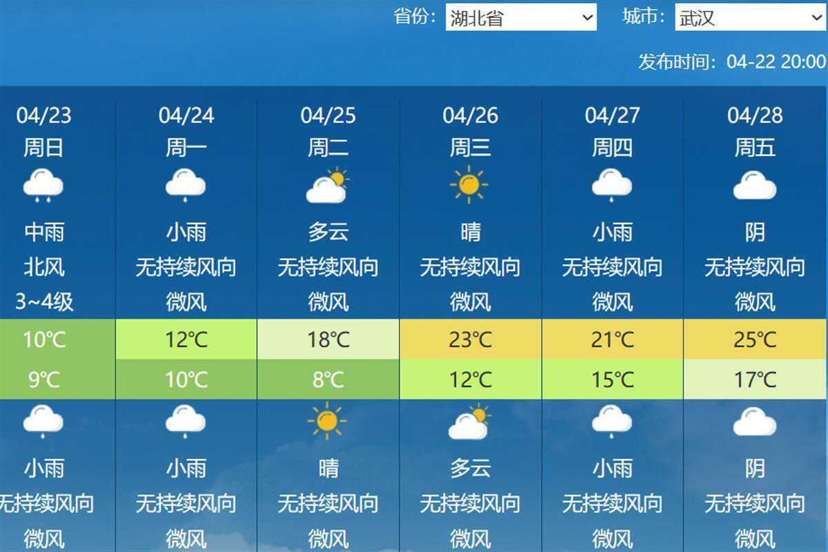 武汉周日阴天有小到中雨,气温8-11℃;下周一阴天有小雨,10-13℃,下周二小雨转多云,12-19℃。