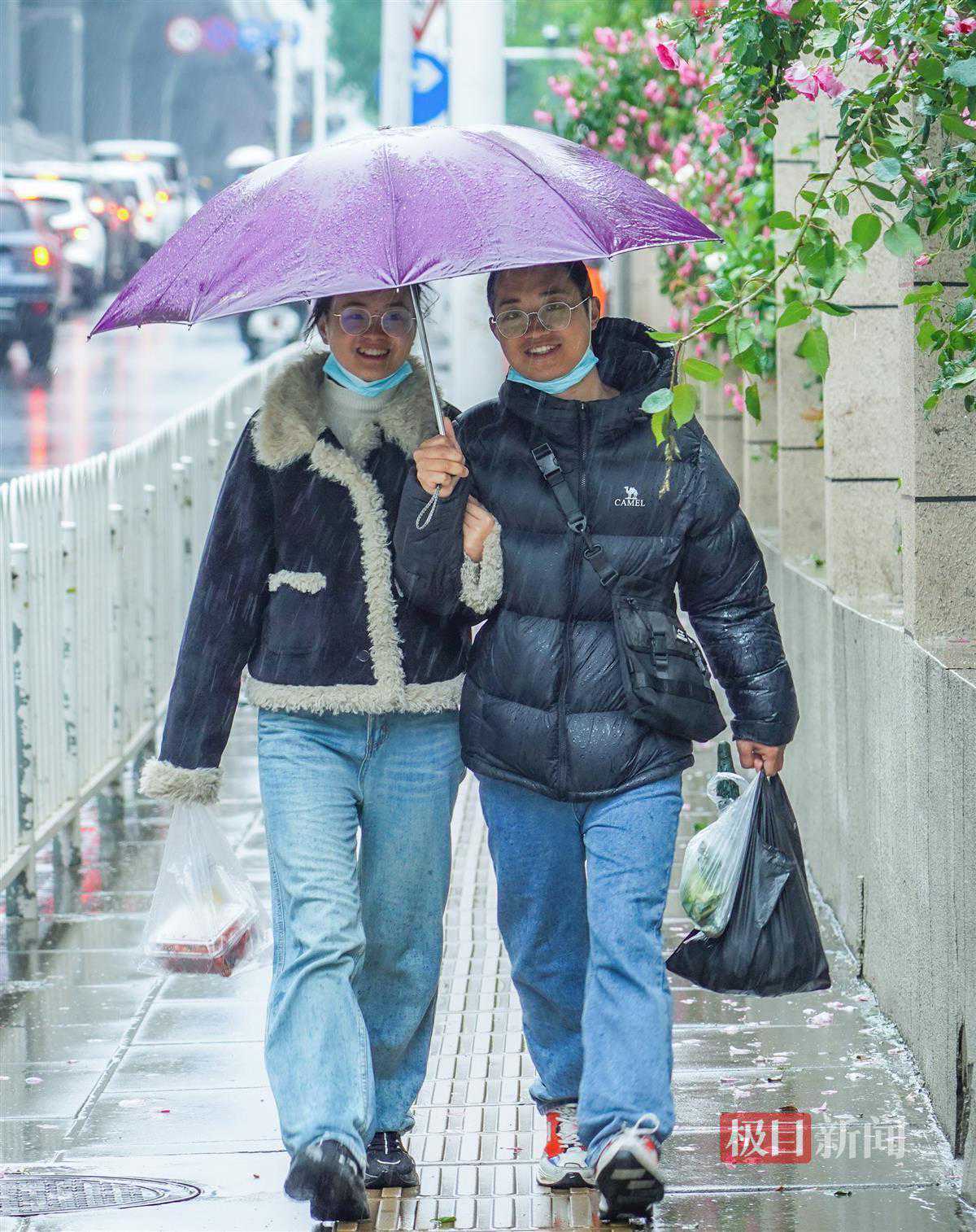 4月22日,风雨中,武汉洪山区熊家咀两位年轻人穿着棉袄