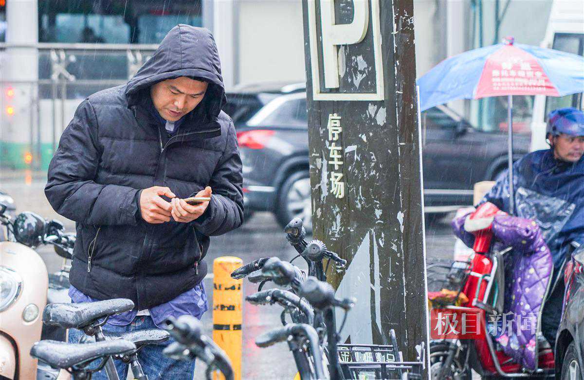 4月22日,风雨中,武汉市洪山区熊家咀户外的人已穿上冬装