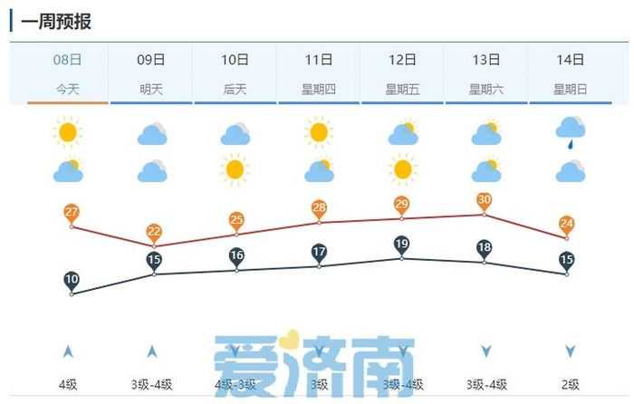 周四(11日)晴转多云,南风3~4级,最低气温济阳区、莱芜区、钢城区、商河县、南山区、起步区12℃左右,市区及其它区县16℃左右,最高气温28℃左右。