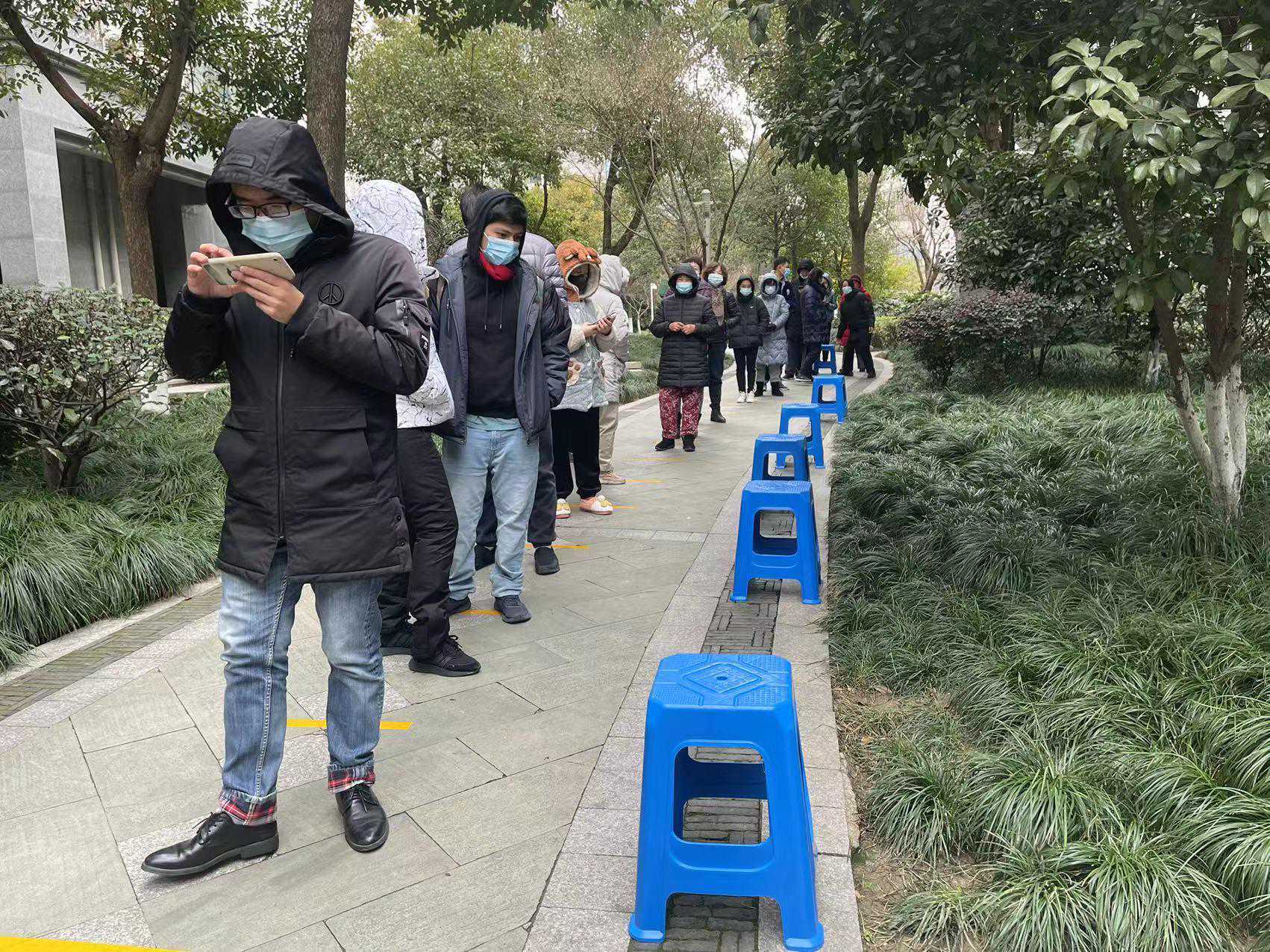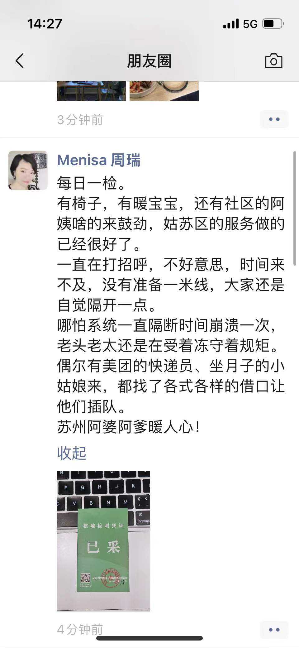 今天上午,在姑苏区虎丘街道西园社区品苑采样点上,一道靓丽的蓝色风景线温暖了居民的心。因采样录入系统网速较慢,核酸检测的速度受到影响。考虑到等候时间较久,工作人员和志愿者立即将社区的凳子搬到点位,给需要的群众接接力、歇歇脚,同时,物业也准备了热腾腾的姜汤发放给居民,让大家暖心的同时也暖了身子。