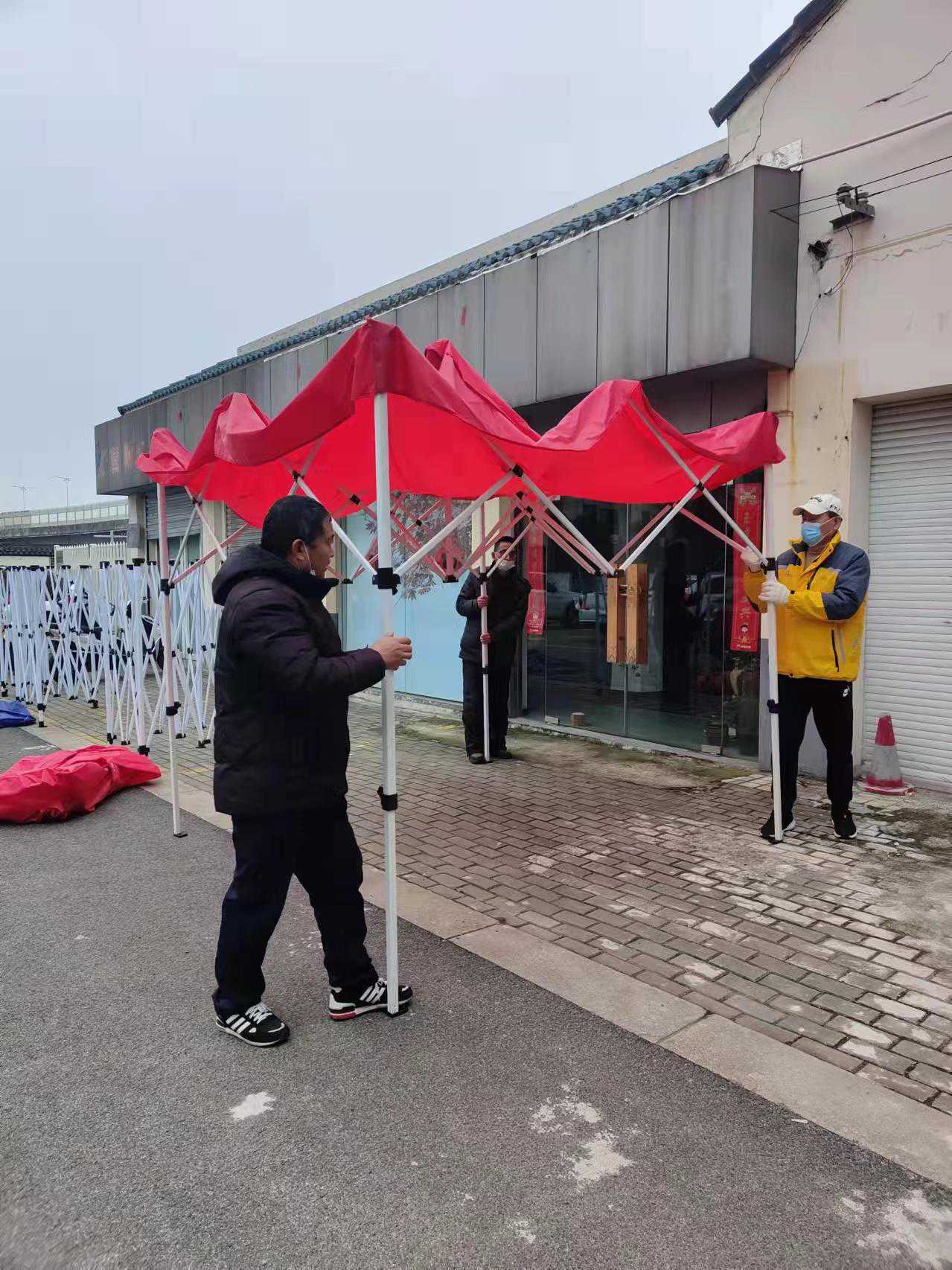 为保障在接下来的雨雪天气有序开展区域核酸检测,16日,姑苏区沧浪街道桂花社区组织防疫志愿者就在辖区内的三个核酸检测点搭起了露天帐篷,为减少雨天运输不便,社区还在点位上准备好了充足的防疫物资。西园社区、南环第二社区也连夜搭建起了应急帐篷,为南环新村疫情防控工作提供便利。此外,各个点位还准备了暖宝宝、热饮等防寒物品,为社区居民驱散阵阵寒意。