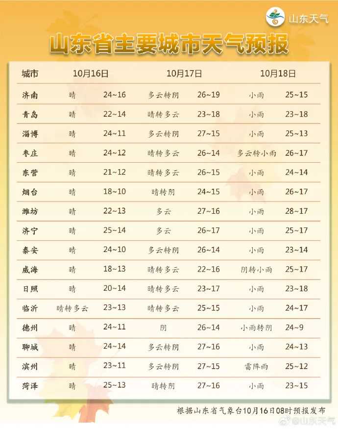 今天(10月16日),山东晴朗天气唱“主调”,最高气温24℃,夜间最低气温10℃,昼夜温差较大,大家早晚时段外出需适当添衣保暖。明天,山东天空云量增多,18日全省将出现小雨天气,公众需注意防范道路湿滑、能见度降低等对交通出行的不利影响。