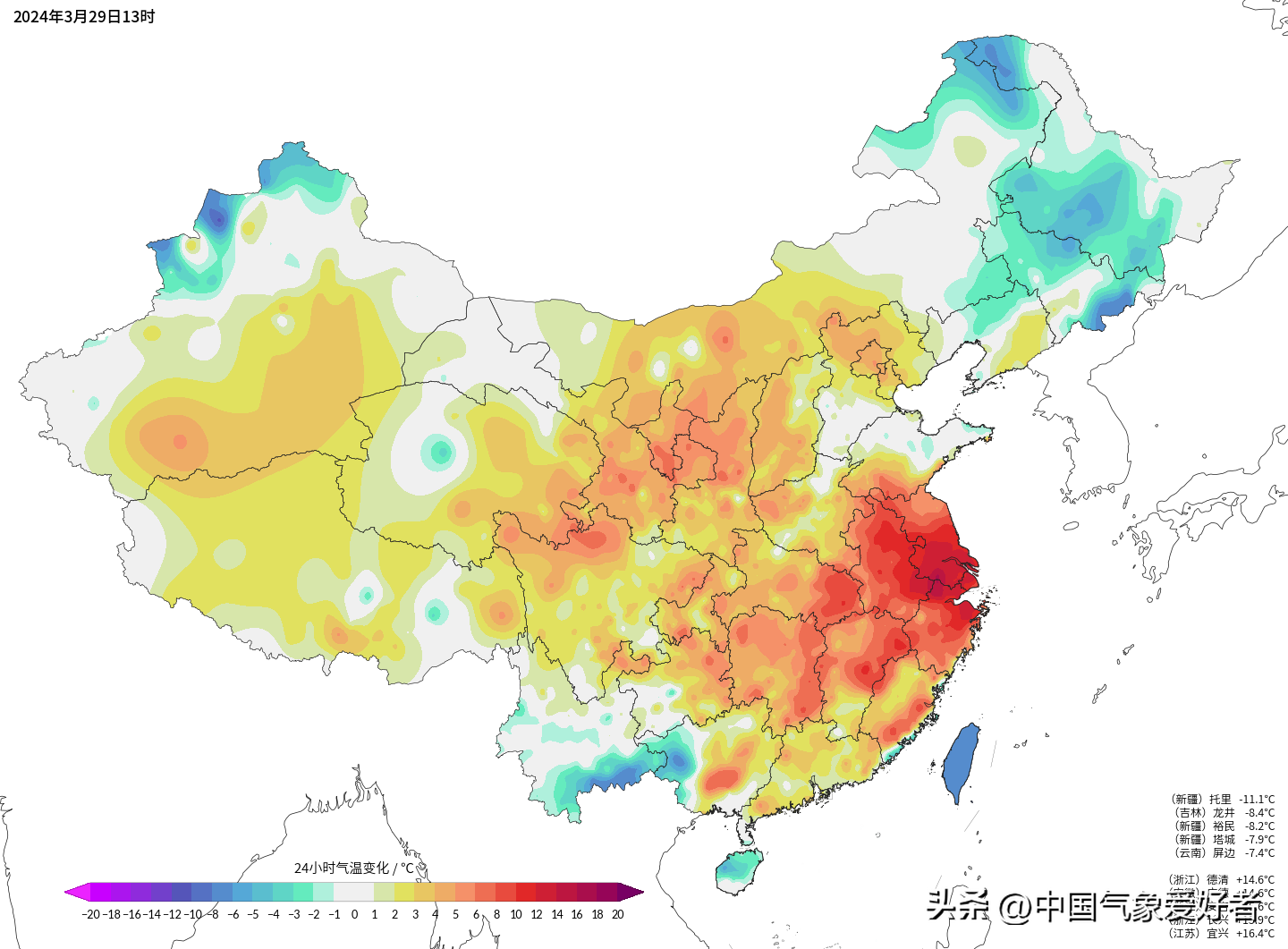 13点的气温变化图上可见,随着中东部大范围的放晴,今天中东部出现了大范围的升温区,在这当中,长三角江浙沪皖成为全国回暖最凶猛的地区,安吉长兴宜兴13点气温比昨天猛升15度以上,体感迅速转暖。