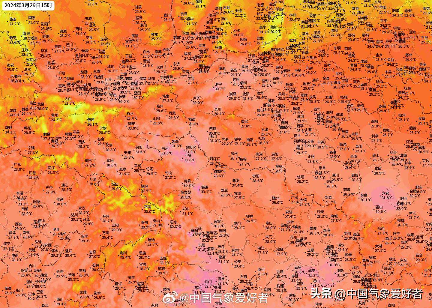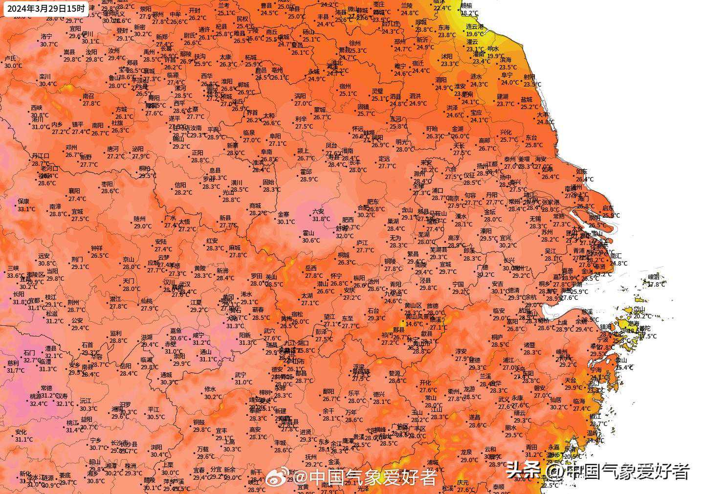 下午15点的整点气温图上可见,随着大范围的升温浪潮来袭,长三角乃至长江中下游地区都大范围的出现了30度上下的气温,户外甚至不能称为暖意融融,开始有些热气腾腾的味道,例如安徽,安徽六安下午15点气温高达31.8度。