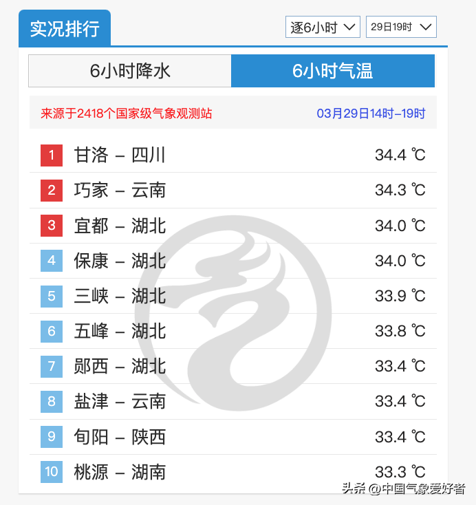 从6小时气温排行榜上更是可以看到,虽然今天全国站点并未出现35度以上的高温天气,但在气温排行榜上,大家熟悉的海南等地居然退出,反倒是四川、湖北、陕西、湖南多地站点上榜,显示出今天不仅大范围升温,而且30度范围迅速扩大,甚至有向北向西迅速蔓延的趋势。