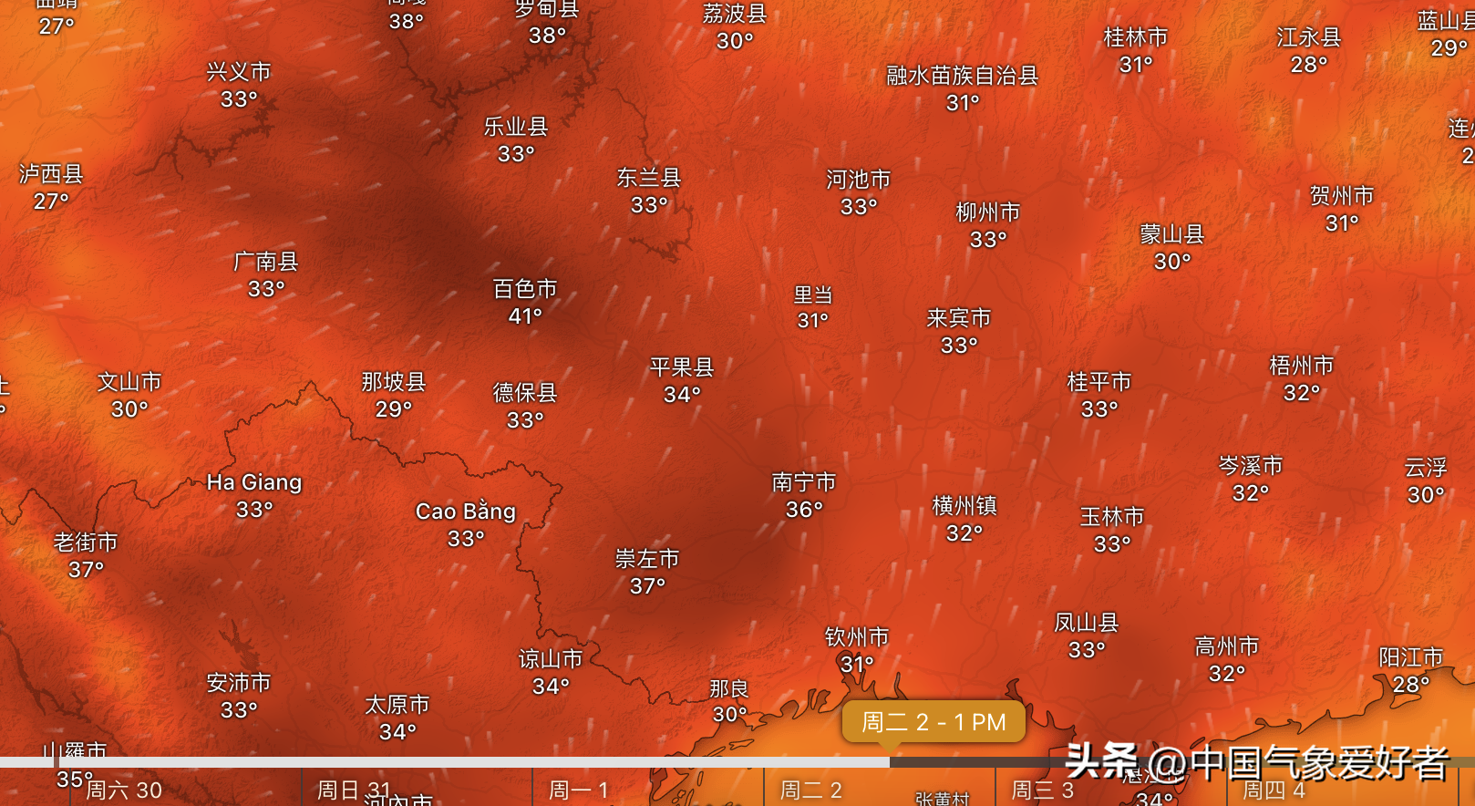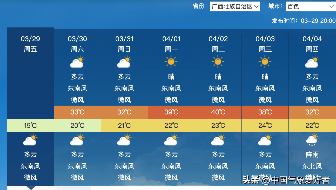 而在3月的最后几天,这股热流还将继续攀升,预计将刷新更多地区的温度记录。随着冷空气的退场,全国各地的气温都在稳步上升,我国南方地区35度以上高温的广西百色甚至有望迎来今年的首个40度高温。如果百色冲上40度,将打破当地最早40度纪录。