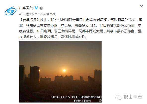 15~16日我省云量自北向南逐渐增多,气温略降2~3℃,粤北、粤东多云有零星小雨,珠三角、粤西多云间晴。