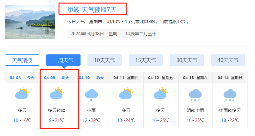 巢湖,同样是多云天气,气温介于9℃至21℃。微风宛如优雅的舞者,轻盈地舞动着,带来春天的气息。让我们沉浸在这充满生机的春光中,感受大自然的奇妙与美好。