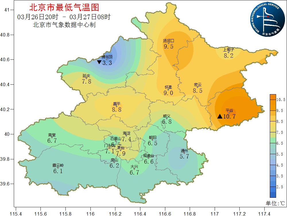 26日20时到27日08时,南郊观象台最低气温6.6℃(27日05:03)
