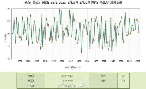 市区徐家汇站目前最高气温29.1℃,已经是1942年至今的同期气温最高值。是否突破150年的历史纪录(29.8℃)?可能性不大,不过这个成绩已经挤进历史前三甲了。