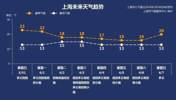 受弱冷空气扩散影响,明天上海天空云层聚起,转为多云到阴的天气,全天气温也会有所下降,在13~23℃之间,偏东风3~4级。