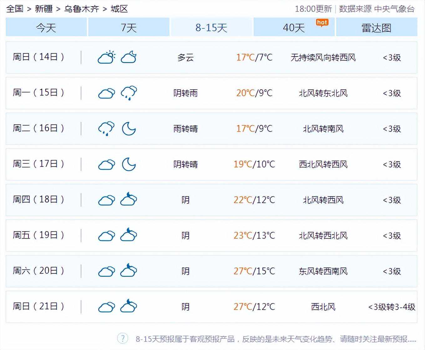 乌鲁木齐4月14日至21日天气预报。图/中国天气网