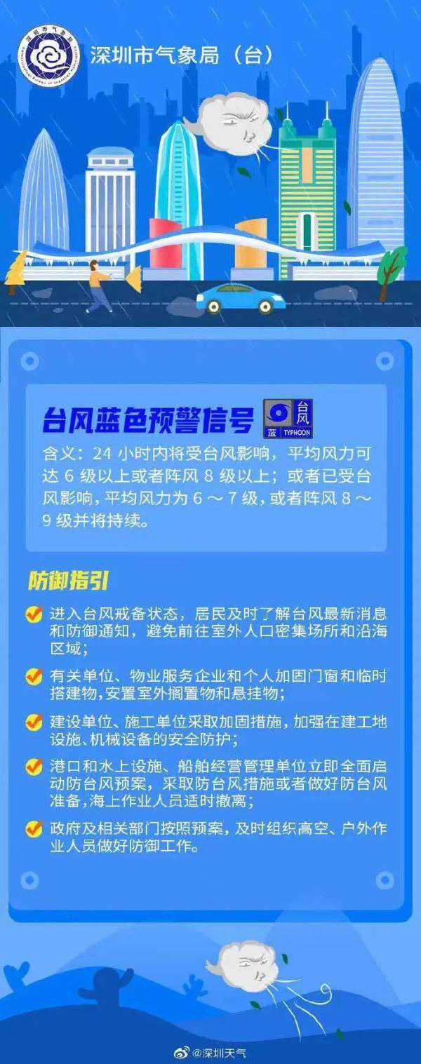 深圳市气象台08月31日06时00分将全市台风白色预警信号升级为蓝色,预计受台风“苏拉”(超强台风级)影响,我市平均风力将加大至6级以上、阵风8级以上。